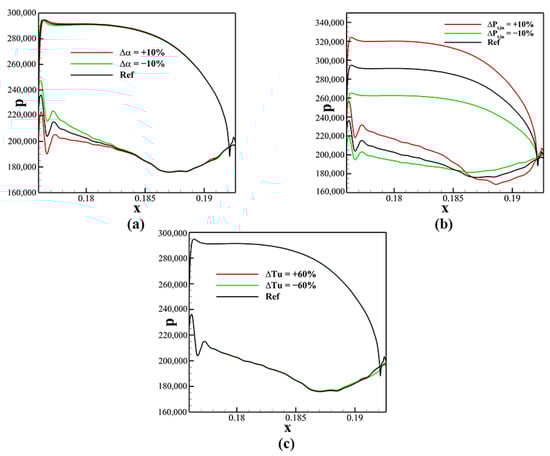 Further understanding of the approximately equivalent impact of inlet flow angle, inlet total pressure, and inlet turbulence intensity on the variations of can be found in Figure 3a. In the relative variation range of each inlet flow parameter, exhibits evident monotonic variation. Considering the impact of inlet flow angle and inlet total pressure, the absolute maximum relative change in is about 3.5%, while it is about 3% considering the effects of inlet turbulence intensity. These results illustrate that the contributions of the three inlet flow parameters to the variations of are almost the same. To better understand the discrepant STs as shown in Figure 13b,c, Figure 14 presents the pressure distributions on the blade. It is the most distinct that even considering the effects of maximum relative variations of inlet turbulence intensity, i.e., , the pressure distributions are almost duplicates of those under the reference condition, indicating that, under the inlet turbulence intensity variation, it is hard to significantly change the outflow angle and Zweifel number. That is why the STs of and with respect to are almost zero. Moreover, in the case of , the loading is significantly higher than that under the reference condition, while it is significantly lower in the case of . The results demonstrate that the inlet total pressure variation can significantly change the outflow angle and Zweifel number. That is why the STs of and with respect to are the largest. Moreover, Figure 14a illustrates the moderate influence of inlet flow angle variation on loading change, from which it is known that the ST of with respect to is also moderate, as shown in Figure 13c. However, the ST of with respect to is almost zero, which requires further investigation.
