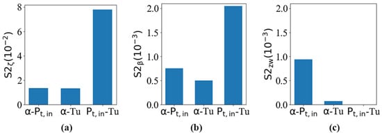 Figure 15 shows the second-order sensitivities (S2s) of performance parameters to pairwise inlet flow parameters, such as -, -, -. From Figure 15a,b, it is known that the coupled effects of - on total pressure-loss coefficient and outlet flow turning are strong, although alone has almost no impact on outlet flow turning. The results demonstrate that when the impact of inlet total pressure and turbulence intensity are considered simultaneously, the variation of outlet flow angle is considerable. Moreover, although alone has a strong impact on outlet flow angle and Zweifel number, the coupled effects of - on the variations of outlet flow angle and are weak. Furthermore, the coupled effects of - on the variation of are almost invisible.