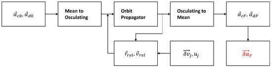 where subscript osc denotes the osculating orbital elements. When impulsive acceleration is applied at a generic time denoted as , the integration of Equation (6) over the impulse establishes the relation between the instantaneous change in velocity in the RTN frame and the subsequent instantaneous changes in the spacecraft osculating orbital elements [,]. We remark that notation stands for the arithmetic difference of the orbital elements after and before the maneuver, and the velocity step is such that . The results above can be extended to our proximity operation scenarios using the Gauss variational equations to express the rate of change in the osculating ROE as