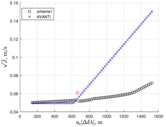 Even though Scheme 1 is designed for rephasing scenarios, it is intrinsically flexible and it can almost reach the minimum propellant consumption even when the relative mean longitude is not the parameter that varies the most. This feature is shown in Figure 2, where the square roots of the cost indexes of Scheme 1 (black circles) and of AVANTI code (blue markers) are plotted for increasing , while keeping the other changes in orbital parameters constant. For the small changes (less than approximately 643 m), AVANTI is slightly better than the Scheme 1 solution, which becomes more convenient for larger values. It should be noted that, at the point where (as indicated by the red symbols in Figure 2), Scheme 1 exhibits a noticeable decline in performance compared to other cases. This decline stems from a possible drawback of the search grid algorithm utilized in Scheme 1, which struggles to accurately identify the optimal positions of the impulses (i.e., and ), resulting in the attainment of only a local minimum []. Nevertheless, it is noteworthy that the percentage difference between the square roots of the cost indexes of Scheme 1 and AVANTI algorithm in that point amounts to just .