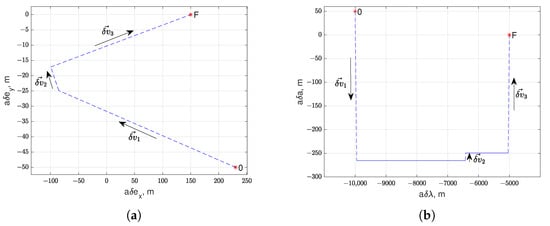 Figure 4a,b depict the transfer in the relative eccentricity vector plane and in the relative semi-major axis/relative mean longitude plane, respectively. Red asterisks with 0 and F indicate initial and final values of the corresponding mean relative orbital elements. The dotted lines represent the instantaneous changes in the mean relative orbital elements due to the impulses, whereas the solid lines denote the evolution of the mean relative orbital elements due to the natural dynamics (only the relative mean longitude varies linearly with time).