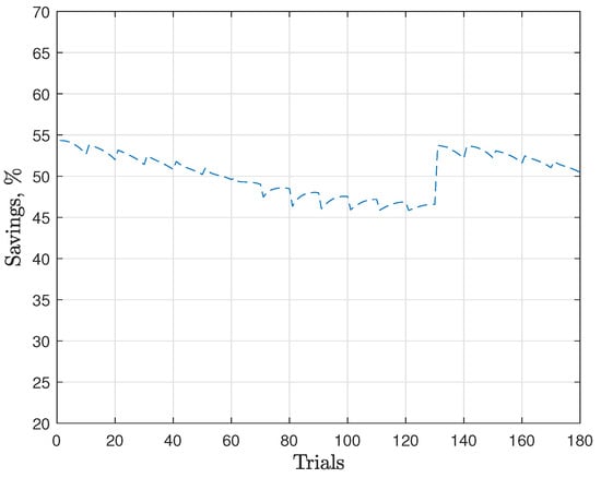 with , , and . Different solutions are evaluated for the selected () combinations, and the minimum one in terms of cost index in Equation (13) is retained.