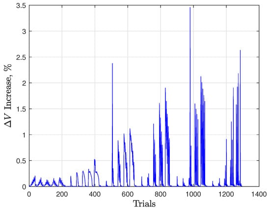 A second parametric analysis is carried out to better understand how different variations of mean relative orbital elements as well as different time windows could influence the performance of Scheme 1 in terms of optimality. In this case, 1296 reconfiguration problems are considered: and vary from to with a step of , from to with a step of , and the predominant change in relative mean longitude is such that and . The final mean argument of latitude is an additional parameter that ranges from to . Figure 6 reports the percentage growth with respect to the global optimum, always lower than 3.5%.
