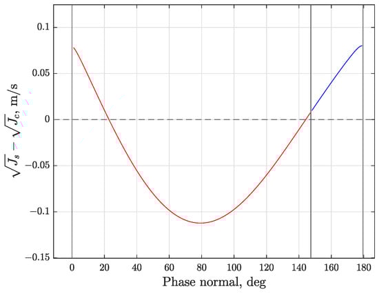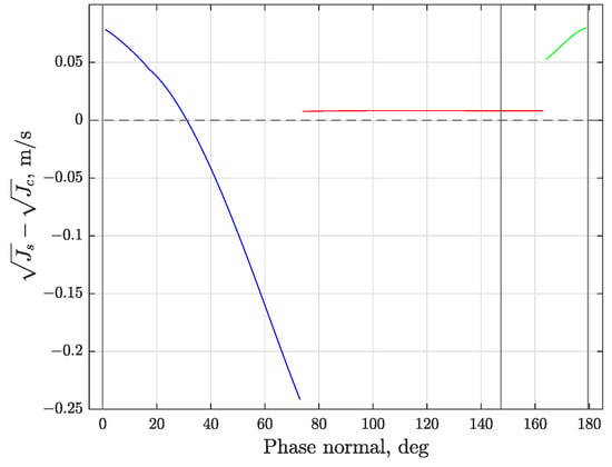 In Figure 7, the difference in the square root of the cost index of Scheme 2 minus the square root of the cost index of Scheme 3 is plotted versus the phase of relative inclination vector variations. The vertical black lines indicate the angular positions, wrapped to the interval – of the planar impulses. The plot color distinguishes solutions where the out-of-plane components of are added at the first and second planar impulses (red) from cases where the addition is at the second and third ones (blue). It is evident that the out-of-plane components of the impulses are more favorable at the positions that surround the phase of the required inclination change. When the plotted difference is positive, Scheme 3 outperforms Scheme 2, i.e., the combination of in-plane and out-of-plane maneuvers leads to propellant savings with respect to the separate approach. For the out-of-plane reconfiguration only, minimum is obtained with one or more impulses applied at the mean arguments of latitude , defined in Equation (32) []. When 3D reconfiguration is considered and the phase is sufficiently close to the positions of the planar impulses selected by Scheme 3, the combination of the impulses is definitely convenient. In these cases (here, for phases close to either or ), it is advantageous to slightly shift the normal impulses in time (i.e., different ) and to combine them with the planar impulses due to vector combination properties.