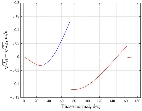 Figure 9 plots the square root of the cost index associated with Scheme 4 minus the square root of the cost index associated with Scheme 3. The blue line identifies the cases in which both Schemes 3 and 4 do not outperform the separate strategy, contrary to the red lines, for which at least one of the combined strategies is beneficial. For this particular reconfiguration problem, Scheme 4 is more convenient than Scheme 3 when combination is useful, excluding two small ranges of the phase that vary from to and from to . We note that when is very close to the mean arguments of latitude of the planar impulses, the plotted difference approaches zero, meaning that almost the same cost reduction can be obtained with both Schemes 3 and 4.