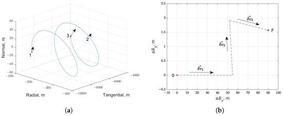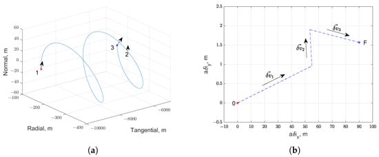 Relative Orbital Element changes. (a) Transfer in Relative Eccentricity Vector Plane. (b) Transfer in Relative Semi-Major Axis—Relative Mean Longitude Plane.