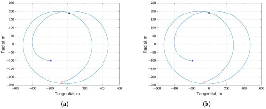 Figure 12a shows the unconstrained relative path and Figure 12b depicts the corresponding constrained trajectory. The position vector at the specified time instant corresponding to is marked with black asterisks, while red and blue asterisks represent the initial and final relative position vectors, respectively.