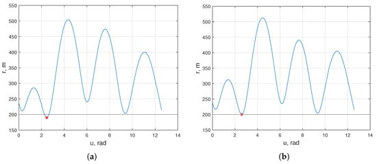 The planar reconfiguration problem is again taken as example and . If Scheme 1 solution enters the forbidden region, the refinement is again tweaked to account for the constraint. Given the reference mean argument of latitude of the minimum distance point in the unrefined solution (red point in Figure 13a), with the corresponding position vector , Equation (47) is linearized and
