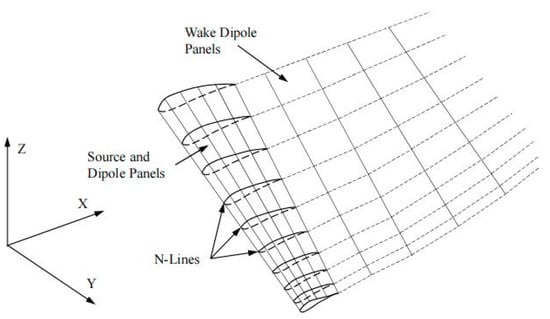 As shown in Figure 1, the wing surface adopts two types of panels: surface source and surface dipole, and the panels are all in the form of planes. In its two-dimensional form [22], the surface adopts a constant linear vortex. In three dimensions, it is difficult to deal with the coordination problem of the surface vortex. Considering the equivalence of the surface dipole and surface vortex [23], a linearly changing surface dipole is used instead. The wing is divided into M parts in the chord direction, and the spanwise direction is divided into N parts by N-lines. At each time step, the distribution of each surface source is uniform, and the surface dipole distribution between every two N-lines changes linearly in both spanwise and chordwise directions. After the wing is deformed, the panels will warp, making it no longer a plane. However, by projecting the space quadrilateral onto the plane unit for calculation, there will be no noticeable calculation error [21]. The wake is composed of surface dipoles shed from the trailing edge of the wing. According to Helmholtz’s law, the total circulation is conserved in the flow field. The wake circulation in the first row of the trailing edge is that of the surface circulation of the wing at k−1 time steps minus the surface circulation of the wing segment at the same spanwise position at k time steps. Over time, the dipole panels continue to fall off from the trailing edge of the wing, producing surface dipoles of varying strengths in the wake. Since the reduced frequency of a large flapping wing aircraft is below 0.2 during cruising flight [24], the unsteadiness is not strong. Similar to Reichert’s [6] “frozen-wake” method, the wake in the model used in this paper smoothly moves backward at the speed of the free flow after the trailing edge, without free deformation with the induced velocity. This will not cause perceptible errors and can greatly improve the calculation speed.