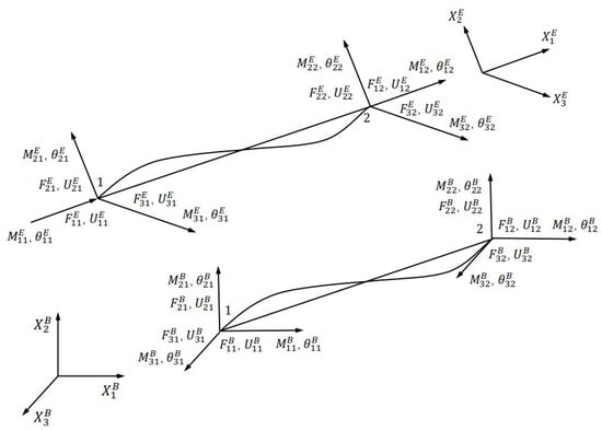 This paper adopts the finite element method based on Kuo-Mo’s [29] method to solve the large deformation problem of the beam. Since the beam in this article is in the form of a slender beam, the deformation is small relative to the length, and the strain is still within the linear elastic range, small strain and small angle assumptions are adopted in each element, and a linear beam element is used. Large displacement deformation is caused by the rigid body movement and rotation of the element, and the overall deformation shows large deformation geometric nonlinearity [30]. This method is relatively simple to accurately solve the exact beam equations [31]. As shown in Figure 2, each element in the method is associated with a local Cartesian coordinate system . When deformation occurs, the coordinate system translates and rotates with the element. The solution is performed in the global coordinate system , which remains fixed to the wing.
