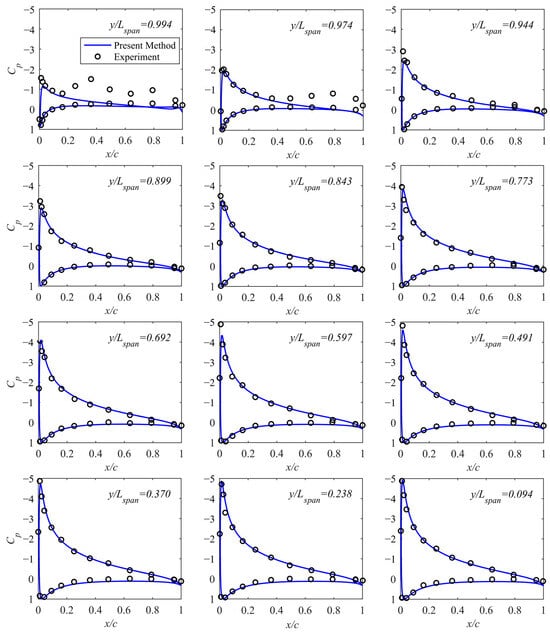 Static 3D aerodynamic force is verified by McAlister’s experiment [33]. The experiment is conducted in a wind tunnel to study a straight rectangular wing of airfoil NACA0015. The wing has an aspect ratio of 6.576 and a square wingtip. The experimental Reynolds number of the wing is 2,500,000. In the article, the data at an angle of attack of 12deg are used for comparative studies. A fixed wake model is used here, and the wake flows along the free flow. A total of 30 panels are used in the span direction and 90 panels are used in the chord direction. As shown in Figure 3, the pressure coefficient in most portions of the wing is in good agreement with the experiment. The boundary layer at a higher Reynolds number is relatively thin, so the pressure coefficient is closer to the inviscid case. There is an obvious error at the trailing edge near the wing tip. This may be due to the influence of the wing tip vortex on the wing tip boundary layer, resulting in an obvious three-dimensional boundary layer effect, and the boundary layer thickens at the wing tip trailing edge. The area of this effect is very small and does not affect the overall validation of the method.