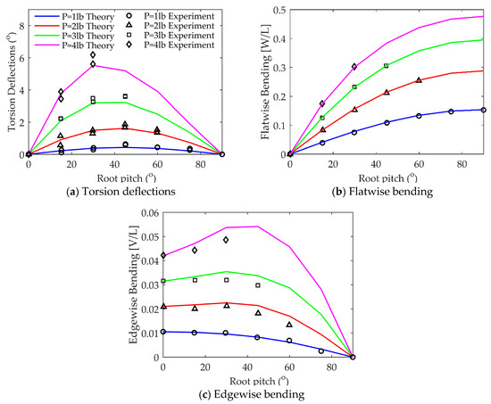 Dowell’s experiment [35] is used to verify the geometric nonlinearity of the beam. In the experiment, a beam with a rectangular cross-section was used. The root was fixed on the device and could be rotated to different pitch angles. A concentrated downward load of P = 1 − 4lb is applied to the tip. Under different root pitch angles, the beam will produce displacements in the flatwise direction, edgewise direction and twist angle. The flatwise direction W and edgewise direction V are perpendicular to the long and short sides of the rectangular section, respectively. The twist angle is a characteristic of the nonlinear beam model. In the linear model, the twist angle would be zero due to the absence of the coupling between the twist and bending displacements. As shown in Figure 5, it can be seen that the calculated results are in good agreement with the experimental results.