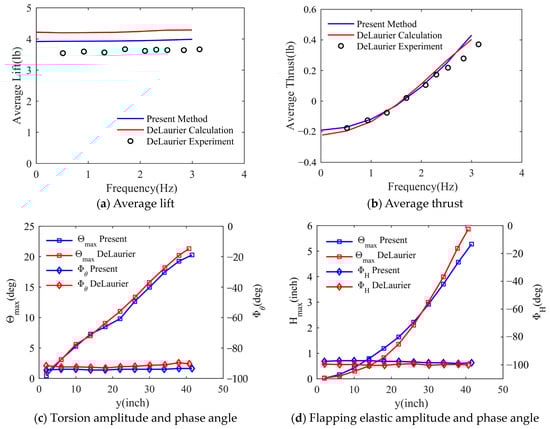 For the spanwise dynamic response distributions, as shown in Figure 6c, the twist angle amplitudes of the inner wings are almost the same, but there are some differences in the outer wing sections. Their phase angles are slightly larger than the calculation results of DeLaurier. As shown in Figure 6d, the flapping elastic amplitudes along the spanwise are flatter than the calculation results of DeLaurier, and their phase angles are slightly smaller. These deviations may be due to a combination of differences in aerodynamic and structural models.