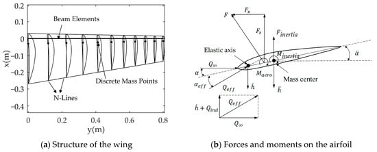 In this article, the passive torsion of the wing is driven by the aerodynamic force and inertia force. Therefore, in order to utilize the aerodynamic force to produce torque on the beam as much as possible, the beam is placed at 10% of the chord line. In order to allow the wings to be passively twisted by aerodynamic force, the flapping wing in this article does not apply a structure similar to a D-box to prevent excessive torsional stiffness. It is assumed that the torsional stiffness is only provided by the beam. The wing profile is assumed to be rigid and is perpendicular to the profile of the beam element node. As shown in Figure 7a, the distribution of the beam elements is consistent with the aerodynamic panel, and is divided into N parts along the span direction by N-lines. The mass of the wing is assumed to be distributed by volume, discretely divided into mass points on the chord line, located at 10% of the chord behind the beam. Figure 7b shows the forces in the 2D wing profile. The airfoil performs plunge motion and pitching motion around the elastic axis, with aerodynamic and inertial forces as driving forces. The angle of attack is the angle of incidence plus the effects of wake-induced velocity and self-motion.