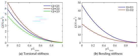 The flapping wing is modeled after the Canadian goose, weighing 3 kg and having a wing mass of 0.15 kg. The half wing span is 0.8m, the wing aspect ratio is 12, the wing root chord length is 0.3 m and the root-to-tip ratio is 2. The forward flight speed is 15 m/s, the range of wing Reynolds number is 367,500 to 183,750. The flapping period is 0.33 s, so the corresponding wingtip reduction frequency k is 0.0952 and the corresponding wingtip Strouhal number St is 0.167. The flapping motion is a simple harmonic motion, and the flapping angle is . As shown in Figure 6a, the wing root airfoil type is NACA8412, the wing tip airfoil type is NACA0012, and the rest of the wing has an interpolated transition from the wing root to the wing tip. The angle of incidence of the root airfoil is 7 degrees assuming the vehicle is performing steady level flight. If the flapping wing is designed to generate sufficient lift and thrust and have high propulsion efficiency, the airfoil must operate within a suitable angle of attack [20,36], so the wing needs to have a suitable deformation law during flapping. In order to balance manufacturing difficulty and flight efficiency, after extensive calculations, it is assumed that the cross-sectional diameter of the beam changes linearly with the wing span, which means the torsional stiffness changes with the wing span to the fourth power. As shown in Figure 8a, torsional stiffness GJ1 to GJ3 represent different torsional stiffnesses. As shown in Figure 8b, bending stiffness EI1 to EI2 and the case of spanwise rigid represent different bending stiffnesses. Torsional and bending stiffnesses that are too small are of little practical significance and are not discussed.