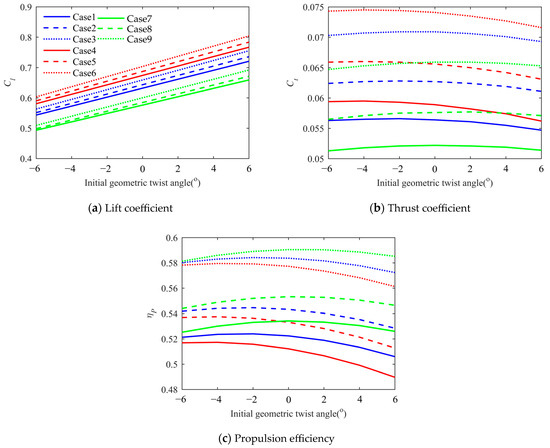As shown in Figure 9a,b, the lift coefficient and thrust coefficient increase as the torsional stiffness of the beam increases. This is because the passive twist angle of the wing will decrease when the torsional stiffness increases, the range of angle of attack of the wing will increase, and therefore the thrust will increase. And due to the influence of aeroelasticity and the camber of the airfoil, the twist angle decreases while the angle of attack increases during downward flapping more than during upward flapping, so the lift increases. Under the same torsional stiffness, the lift will increase as the initial geometric twist angle increases, because it is equivalent to increasing the average angle of attack of the wing. Under the same torsional stiffness, as the initial geometric twist angle increases, the thrust coefficient first increases and then decreases. This is because thrust is mainly generated by the outer section of the wing, and the ability of the airfoil to generate thrust is strongest when the average angle of attack is near 0 degrees.