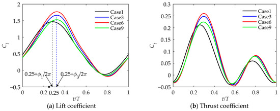 As shown in Figure 10, the changes in lift coefficient and thrust coefficient within a cycle are compared. It can be seen that the lift coefficient changes with time basically as a sinusoidal curve, while the flapping angle is a cosine curve. Due to the influence of unsteadiness and inertial force of the wing mass, the lift coefficient curve has a phase lag relative to the sinusoidal curve. The lift coefficient is positive in the downward flapping process and negative in a small section in the upward flapping process. The thrust coefficient is positive in the downward phase and is basically positive in the upward process, and the thrust coefficient in the downward process is greater than that in the upward phase. Comparing Case 1 with Case 3, as the bending stiffness decreases, the peak and average values of the lift coefficient and thrust coefficient will increase during the entire cycle, and the phase lag is greater than . Comparing Case 3, Case 6 and Case 9, it can be seen that as the torsional stiffness increases, the lift and thrust coefficient will increase, and the difference in phase lag is very small.