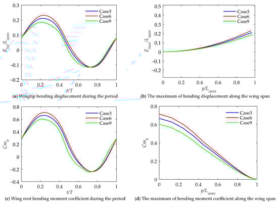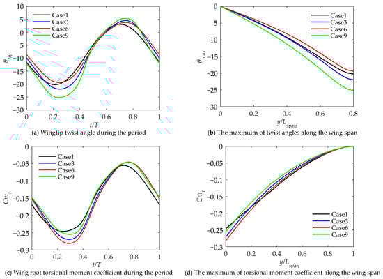 In order to further study the state of the wing and the effects of torsional and bending stiffness during the entire period, Case 1, Case 3, Case 6 and Case 9 were selected for comparison. Among them, Case 1 and Case 3 have the same torsional stiffness but different bending stiffnesses. Case 3, Case 6 and Case 9 have the same bending stiffness but different torsional stiffnesses. The initial geometric twist angle is taken as 0 degrees.