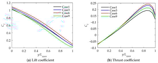 Figure 13 shows the average lift coefficient and average thrust coefficient along the span direction during the period. The lift coefficient gradually decreases from the wing root to the wing tip. The thrust coefficient first gradually increases from the wing root, and due to the three-dimensional effect, the thrust coefficient of the wing tip will decrease. At the wing root, the thrust is even negative. Generally speaking, the outer wing mainly produces thrust, and the inner wing mainly produces lift. Comparing Case 1 and Case 3, it can be seen that as the bending stiffness decreases, the effect on the lift coefficient is not as obvious as on the thrust coefficient. The maximum value of the thrust coefficient will become larger and the center of thrust generation will be closer to the wing tip. Since the outer wing’s small camber airfoil is more suitable for generating thrust efficiently, the propulsion efficiency will also increase. Comparing Case 3, Case 6 and Case 9, changes in torsional stiffness have no obvious impact on the thrust coefficient, but the lift coefficient of a wing with large torsional stiffness will increase significantly throughout the span.