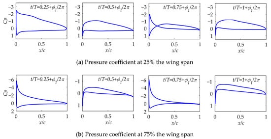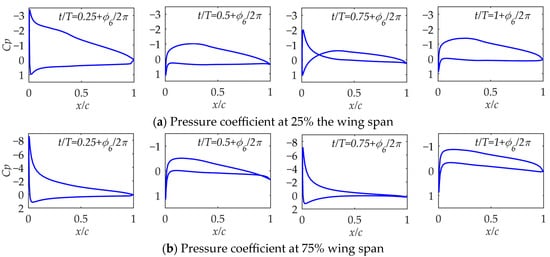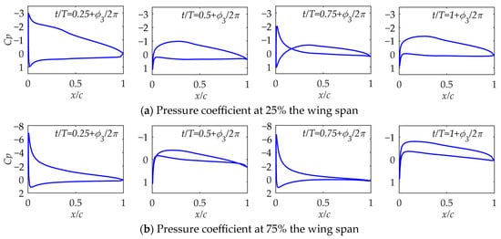 In order to further study the state of the airfoil surface during the period, the airfoil surface pressure coefficients of different span positions at a specific time in Case 1, Case 3, Case 6, and Case 9 were compared. The time selected should include the moment of maximum lift coefficient so that more features will be revealed. As shown in Figure 14, in Case 1, the pressure coefficients at 25% and 75% the wing span for t/T = 0.25 + , t/T = 0.5 + , t/T = 0.75 + , and t/T = 1 + are selected. It can be seen that at 25% span of the wing, the airfoil camber and average angle of attack are large, and the unsteadiness is weak. During the entire period, the airfoil basically operates within the positive angle of attack range and mainly generates lift.