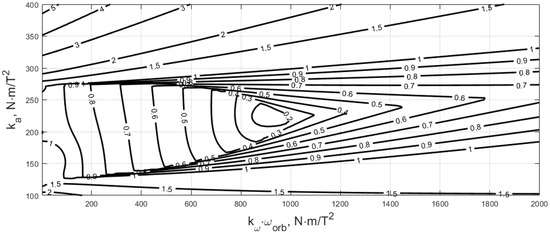 Figure 1 provides the area of sensible control gain, which is then manually adjusted. This cannot be performed manually with matrix gain. However, control scheme (12) has distinct advantages over (10). Matrix gain is capable of handling significant differences in inertia moments. Also, this control scheme stabilizes the satellite not only in the gravitational equilibrium but in any predefined attitude in the orbital frame. Simple feedback law struggles with this task.