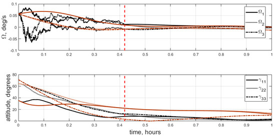 The vertical, red, dotted line indicates the switching moment, when the satellite is close to the required attitude and SC is replaced with LC.