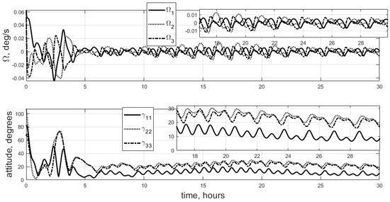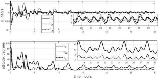 The stabilization accuracy for an uneven mass distribution is around 11–12 degrees, whereas Case 1 provides 7-degree accuracy. Final accuracy is significantly affected by the relations between the moments of inertia. In some specific situations, control scheme (10) may completely fail. For example, a 3U CubeSat with two large moments of inertia and one small moment of inertia quite often cannot be stabilized with simple Lyapunov control. A comparison of