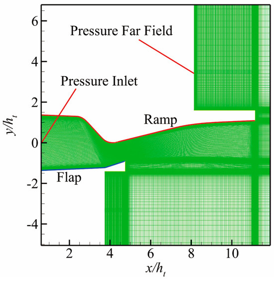 where ρ, u, v, p, τ, and e represent the density, x-direction velocity component, y-direction velocity component, pressure, shearing stress, and total energy per unit mass, respectively. The inviscid flux is computed using the Roe flux-difference splitting scheme on the control surfaces. A second-order upwind scheme is used to discretize the convective term. A central second-order difference scheme is used for discretizing viscous terms. An implicit scheme is used for time stepping. The method based on the least squares cell is used to compute the gradient. During the calculation, the mass flow through the inlet and the force on the ramp and flap are used to monitor convergence. The calculation can be considered convergent when the results of the above calculation remain constant as the number of iteration steps increases. In the numerical simulation, the boundary conditions (i.e., pressure inlet, pressure outlet, and pressure far field) are adopted.