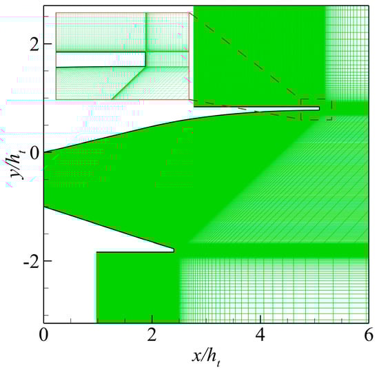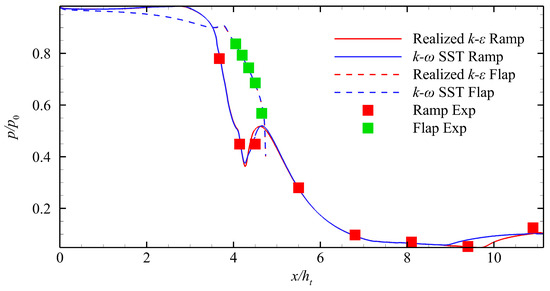Figure 2 shows the computational grid, and Figure 3 shows a comparison of the numerical results of the normalized pressure distribution on the ramp and flap between CFD and the experiment. The numerical results show that when x/ht > 8, the realizable findings of the k–ε model are closer to the experimental results than those of the k–ω SST model. Thus, all numerical simulations in the remainder of this paper use the realizable k–ε turbulence model.