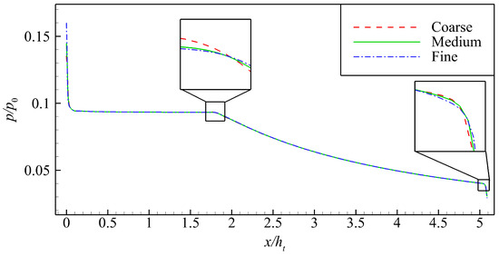 A mesh independence study is conducted to eliminate the influence of the mesh size on the results. The computational model is the nozzle designed using the proposed method in Section 4.1, as shown in Figure 4. The computational grids of the nozzle internal flow field with different scales are used, namely, the coarse (75,000 cells), medium (150,000 cells), and fine (300,000 cells) grids. Figure 5 shows the normalized pressure distribution on the ramp using different grid scales under the same working conditions. In general, the pressure distributions obtained using the three grid sizes are the same. However, the maximum relative error between the coarse grid and the fine grid is 0.25% at x/ht ≈ 1.8 via amplification at x/ht ≈ 1.8 and 5.1. Moreover, the maximum relative error between the medium grid and the fine grid is 0.18% at x/ht ≈ 5.1. A medium-scale computational grid is used in the following numerical simulation to comprehensively evaluate the numerical accuracy and cost.