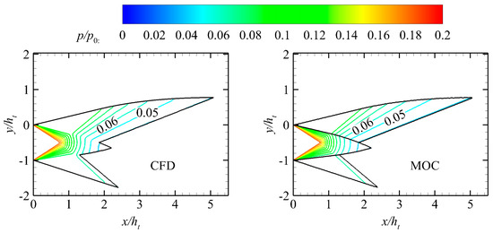In the design program, the initial values for θ1, βMa, and β should be provided and are set to 30°, 1, and 0.75, respectively. A comparison of the normalized pressure contours between the inviscid CFD and MOC is shown in Figure 8. The results show the accuracy of the proposed design method.