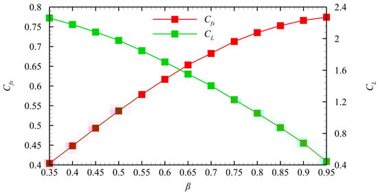 Figure 9 shows the effect of different β values on the axial thrust coefficient and lift of the nozzle. In Figure 10, β only affects the length of the nozzle flap. However, it does not change the height of the flap or the profile of the ramp. The length of the flap decreases as β decreases, and the rate of change in the nozzle area along the axial direction increases. Thus, when β is extremely small, the separation zone appears near the flap due to the large rate of change in the nozzle area along the axial direction. The effectiveness of the design method is compromised by the separation zone. Figure 9 shows that β is positively correlated with the axial thrust coefficient Cfx and negatively correlated with the lift force. Figure 10 shows that the streamline near the lower wall deviates downward from the axial direction as β decreases. This phenomenon results in a decrease in axial momentum at the outlet, a decrease in axial thrust, and an increase in lift.