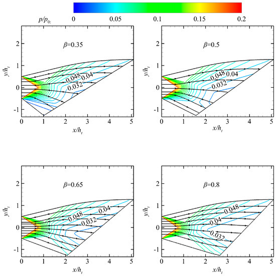 Pressure contours of nozzles with different β values.