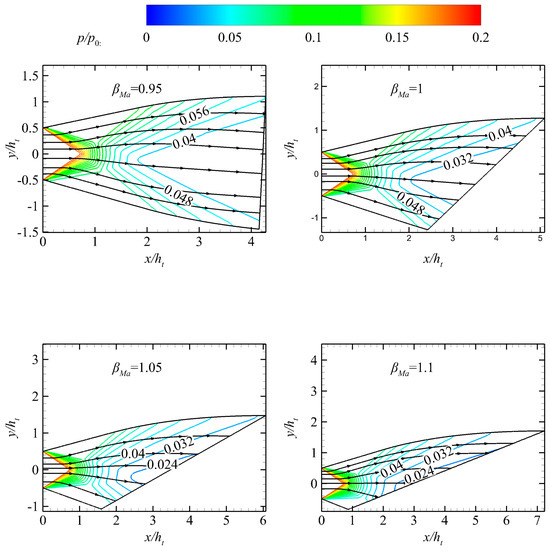 Pressure contours of nozzles with different βMa values.