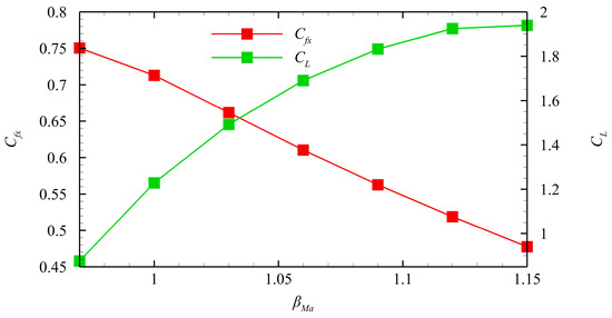 Figure 12 shows the influence of different βMa values on the thrust coefficient and lift of the nozzle when β = 0.75. The figure shows that an increase in βMa results in an increase in the total length of the nozzle and a decrease in the length of the nozzle’s flap. Thus, the positive lift provided by the ramp increases, while the negative lift provided by the flap decreases simultaneously. The increase in the geometric asymmetry of the nozzle leads to greater inhomogeneity of the aerodynamic parameters at the nozzle outlet, resulting in a decrease in the axial thrust coefficient of the nozzle. Moreover, the calculation results show that an excessively high βMa causes significant nozzle deformation, which further leads to a severe deterioration of nozzle performance.