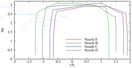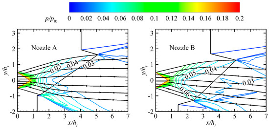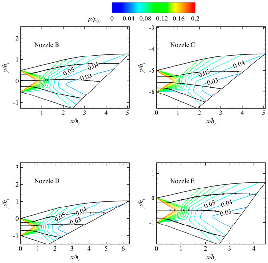 The nozzles that meet the geometric constraints specified in Table 3 are designed using the design program described in Section 3.3. These nozzles also have the same height constraint as Nozzle B. The β and βMa values for each nozzle are shown in Table 4. The normalized pressure contours are shown in Figure 14, whereas the distribution of the Mach number on the outlet section is shown in Figure 15. Additionally, the pressure distribution on the ramp and flap is shown in Figure 16.