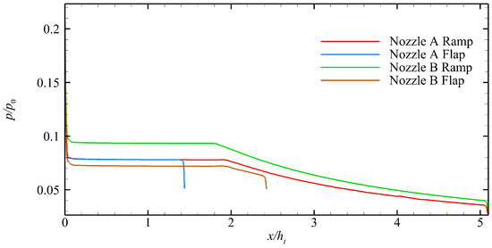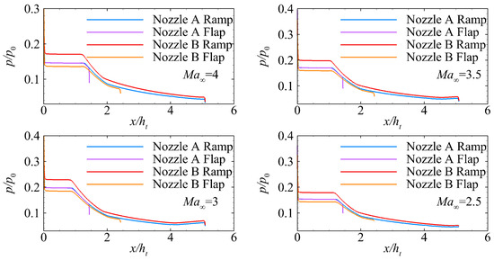 Pressure distribution on the ramp and flap of each nozzle at different operation points.