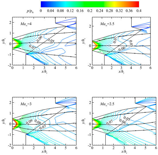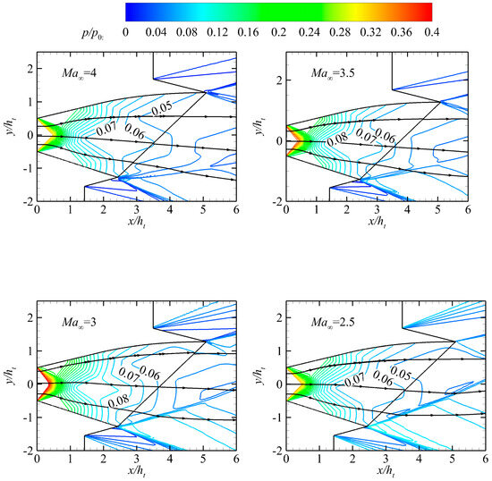 In Table 6, the operating points Ma∞ = 2.5 and Ma∞ = 3 are in the overexpansion state. The operating points Ma∞ = 3.5 and Ma∞ = 4 are in a state of underexpansion. However, the NPR is less than that at the design point. In addition, the transition point of the combined cycle engine’s working mode is typically near Ma∞ = 2.5 during actual flight. Therefore, the off-design working points presented in Table 6 represent the typical performance of the nozzle throughout the entire flight envelope in the ramjet mode.