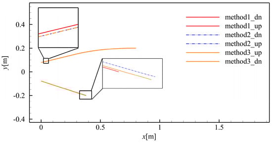 Figure 23 shows the nozzle profiles obtained using Methods 1–3. Overall, there is not much difference in the profiles obtained using the three design methods. In theory, the denser the characteristic line grid, the greater the overlap of the profiles obtained using the three design methods. So, it can be proven that these three methods are equivalent.