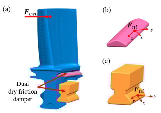 In the blade–damper system, the blade acts as the main structure, and the damper is a separate structure. The damper is not elastically connected to the bladed disk, and it interacts with the blade only through the nonlinear contact forces. Therefore, the dynamic models of the blade and the dual dry friction damper are created separately. For a case of steady-state forced response analysis, the dynamic equation for the blade and dual dry friction damper is