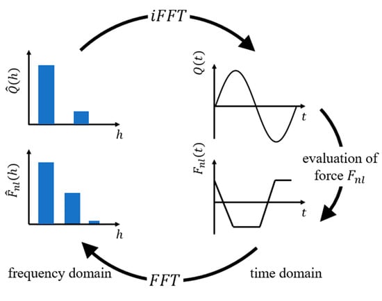 Nonlinear force is dependent on contact displacement and exhibits time-dependent characteristics, making it challenging to estimate prior. To deal with this issue, the alternating frequency/time scheme (AFT) [] may be employed. The specific process is illustrated in Figure 6, where the inverse Fast Fourier Transform (iFFT) is employed to convert the from the frequency domain into the time domain. The frictional contact model in Section 3 is utilized to resolve the frictional force within the time domain, and eventually, the frictional force results are reverted to the frequency domain as using the Fast Fourier Transform (FFT) for subsequent iterative calculations.