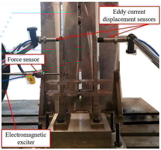 The left blade is excited by an electromagnetic exciter, designating it as the directly excited blade. Conversely, the other blade is termed the indirectly excited blade. A force sensor plays a pivotal role as it establishes a connection between the excitation rod and the directly excited blade. Stepped sine frequency response testing is carried out using a constant input force level, which is measured with the force sensor, and kept constant through software control. The response level of both blades is measured through eddy current displacement sensors positioned at the tip of each respective blade.
