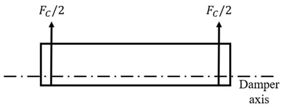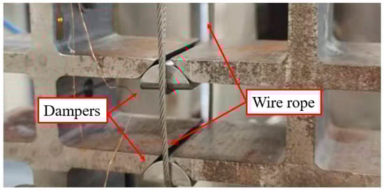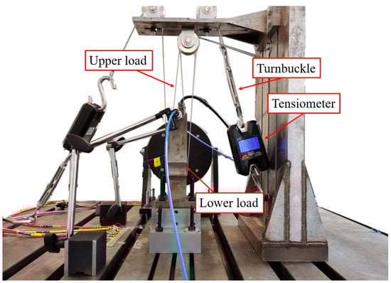 The UP and LOW damper of the dual friction damper is loaded with centrifugal force using a similar form. The head and end of the damper axial direction are connected to the tensiometer using a wire rope (Figure 8 and Figure 9), and two wires were chosen instead of one to distribute the load along the damper axis more uniformly. The opposite terminus of the tensiometer is linked to a turnbuckle, and fine-tuning the turnbuckle’s tension allows for a linear adjustment of the centrifugal force exerted on the damper. The wire rope possesses a degree of flexibility to facilitate the vertical movement of the damper. Although there exists a slight deviation angle of less than 3° between the wire rope and the vertical axis, the resultant error stemming from this aspect is of negligible magnitude.