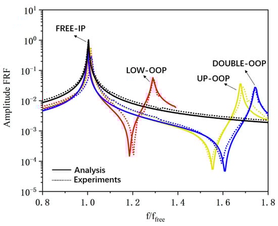 Experimental results corresponding to different centrifugal force levels of dual dry friction dampers were available. Figure 10 shows the experimental (dashed line) and numerical (solid line) FRF results of the directly excited blade for the fully stuck state of the damper with an excitation force of 1 N. FREE represents blade-free, UP represents the upper damper in the dual dry friction damper acting separately, LOW represents the lower damper in the dual dry friction damper acting separately, and DOUBLE represents both the UP and LOW dampers in the dual dry friction damper acting at the same time. The horizontal axis is the normalized frequency, which is the sweep frequency divided by the FREE state resonance frequency. The vertical axis is the normalized amplitude, which is the sweep amplitude divided by the FREE state resonance amplitude. It is notable that in the case of the other three conditions (LOW-IP, UP-IP, and DOUBLE-IP), the IP modes exhibit comparatively minor frequency shifts when contrasted with the FREE condition. Consequently, the curves corresponding to these conditions closely align with the FREE-IP mode and have been omitted from labeling due to their overlapping characteristics. This is due to the fact that for the semi-cylindrical damper, more rolling than sliding occurs between the damper and platform contact surfaces during the IP mode, and thus no additional friction is generated, as described in detail in [].