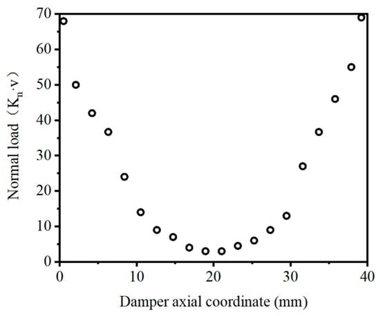 A distribution load, as illustrated in Figure 11, is employed to scrutinize the contact condition along the length of the damper. Meanwhile, the normal load is ascertained through a nonlinear static analysis. As depicted in Figure 12, the normal load on the damper surface was produced by the normal contact stiffness times the static normal relative displacement. Remarkably, it is evident that the distribution of the static normal load is far from uniform. Specifically, the loads at the front and rear ends of the damper exhibit higher values, while the normal loads within the inner region are comparatively lower. Moreover, this non-uniform distribution also leads to instances of separation occurring within the system.