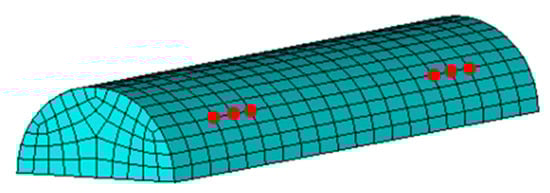 Building upon the insights garnered from both experimental data and static analysis, a tuning strategy is implemented as follows: Commencing from the midpoint of the damper surface, the contact elements are progressively detached until the resonance frequency obtained in the full-stick condition matches the resonance frequency derived from experimental curves (as shown in Figure 8). The optimal alignment is achieved when a total of six contact elements are present at each end of the damper. The position of the contact elements is shown in Figure 13 (red dots represent contact elements). At this time, the contact stiffness of the contact surface is calculated utilizing the numerical contact model developed by Allara []. Subsequently, this calculated contact stiffness is uniformly distributed across the activated contact nodes. The static normal load on both sides of the damper is computed by solving the decoupled static balance equation of the damper in the context of frictional contact []. This systematic tuning approach enables the accurate representation of the contact conditions, enhancing the reliability of the analysis.