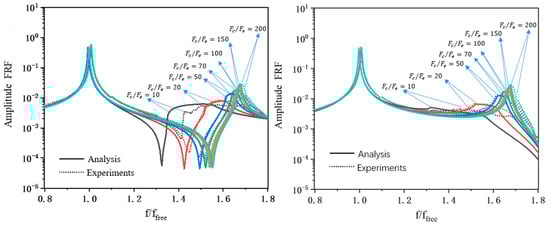 The congruence between experimental and simulation results is readily apparent; although there is a slight disparity wherein the numerical frequency shift falls below the measured value, the overall agreement remains strong. It is found that the damper will not slide in the IP mode, as should be expected, and the value of the contact parameter will not influence the response [], as shown in the above figures. Therefore, the comparison of results focused on the OOP mode. The results of different response curves are plotted on the same graphs to present so-called “performance curves” of the damper in analogy with similar curves in the literature [,,]. The resonance amplitudes and frequencies are plotted versus the ratio both for the directly and indirectly excited blades for the OOP mode, as shown in Figure 17 and Figure 18.