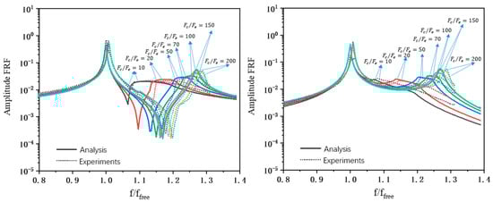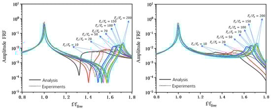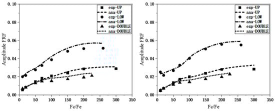 Subsequent analyses are conducted in accordance with the established tuning strategy. The excitation force was kept at 1N during the test. The centrifugal force on the damper is varied to measure the vibration response of the system. In Figure 14, Figure 15 and Figure 16, the experimental FRF curves for different ratios are compared to the corresponding numerical FRF curves for the directly and indirectly excited blades of UP, LOW, and DOUBLE dampers.