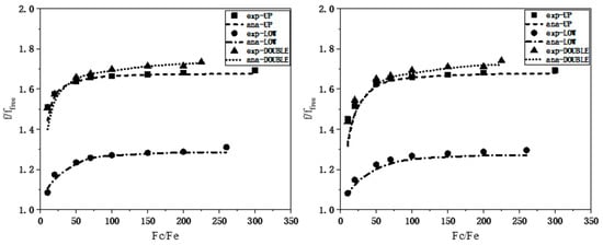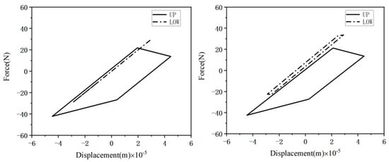 In addition, the damper performance curves when the UP damper is acting are close to those when the DOUBLE damper is acting. Therefore, when the ratio is 100, the frequency f = 435 Hz is chosen to analyze when the DOUBLE damper acts. The hysteresis curves of the left and right contact surfaces when the UP and LOW dampers act at this time are shown in Figure 19, where the dashed line represents the LOW damper and the solid line represents the UP damper.