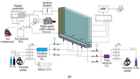 Figure 1a shows a schematic of the experimental setup. The setup consists of a slit combustor, a supply system of fuel and oxidizer, an ignition system, and a data acquisition system. The slit combustor is formed by two parallel slabs of organic glass 40 mm thick, 400 mm high, and 800 mm long. The slabs are fixed in a steel frame with two horizontal rows of windows: three 234 × 163 mm windows in the top row and three 234 × 181 mm windows in the bottom row. The slit width (6.5 ± 0.2 mm), height (394 ± 1 mm), and length (784 ± 1 mm) are fixed. Thus, the slit volume is 2.00 ± 0.04 L. Fuel (ethylene) and oxidizer (pure oxygen or a mixture of oxygen and nitrogen) are supplied to the slit from the fuel and oxidizer receivers through three parallel manifolds with solenoid valves and discharge orifice plates. The cross section and length of the manifolds is 6 × 6 mm2 and 810 mm, respectively. At the slit bottom, the manifolds are ended by two rows of calibrated injector nozzles separated by a thin foil 0.1 mm thick (Figure 1b). The diameter of the injector nozzles (1.0, 1.4, 2.0, or 2.8 mm) is selected for the appropriate flow rate and fill time. Note that the slit width of 6.5 mm was chosen as a sort of an average value among the values reported in the literature for RDEs fueled by ethylene–oxygen–nitrogen mixtures.